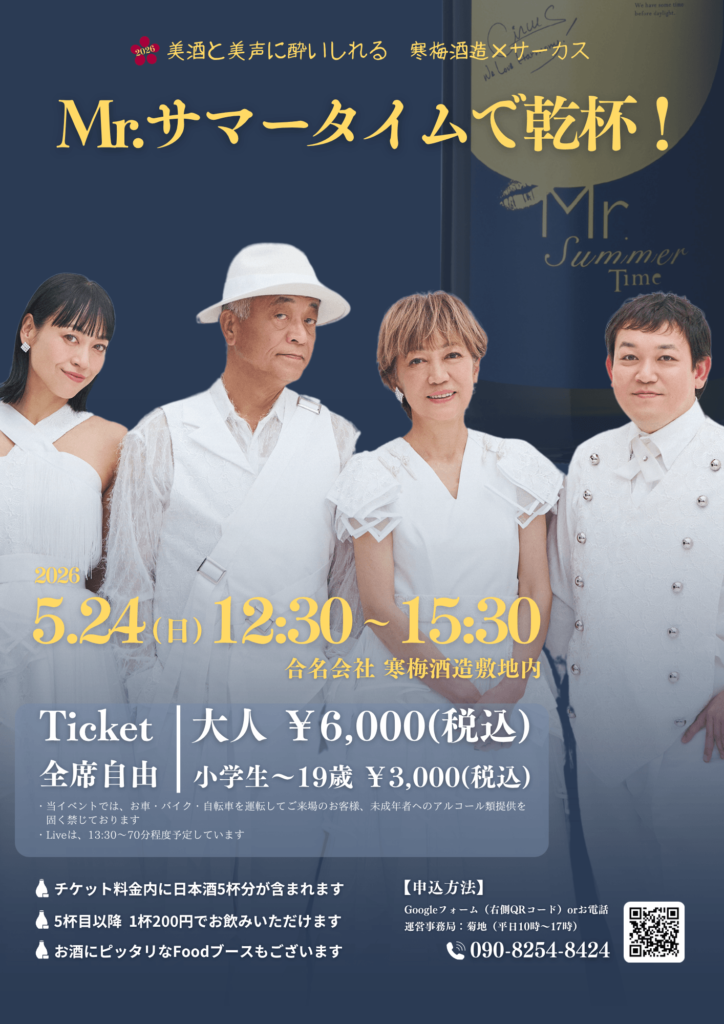 今年も寒梅酒造が醸す夏酒「Mr.サマータイム」の収穫祭をヴォーカルグループ「サーカス」と共に開催します。LIVEはもちろん、Mr.サマータイムをはじめ当蔵の日本酒をご堪能ください。抽選会も企画しております♪またFoodコーナー(お弁当やお酒にピッタリなFood各種)、ソフトドリンクもご用意いたしますので、お子様連れでもお楽しみいただけます。
